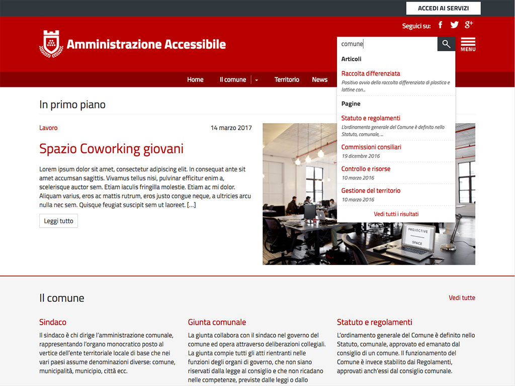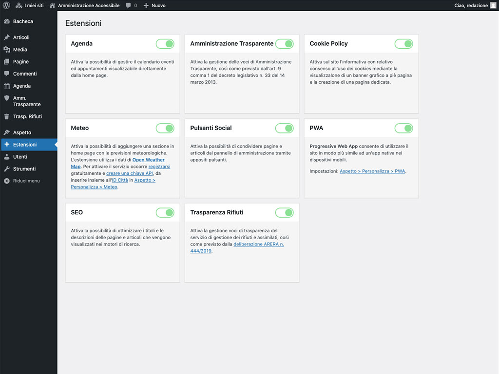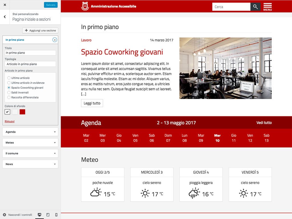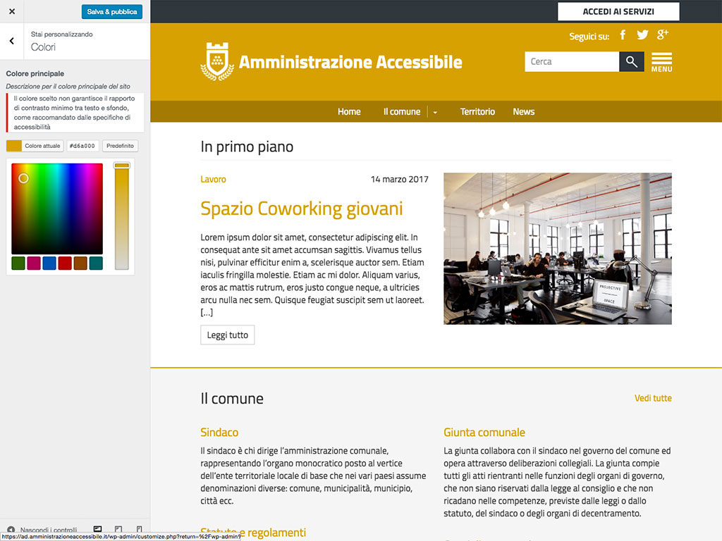 Amministrazione Accessibile è il primo sito web per la pubblica amministrazione basato sul CMS WordPress e sviluppato secondo le nuove Linee guida di design per i servizi web della PA contenute nel Piano triennale per l’informatica nella Pubblica Amministrazione. Una soluzione integrata e open source, ideale per comuni, scuole ed enti pubblici in genere.